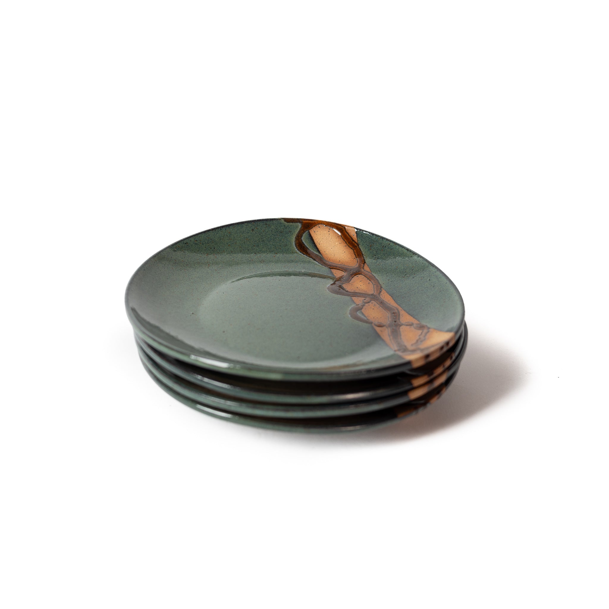 Greybeard is one of our four Signature Glazes. It contains tones of green, turquoise, blue, and grey, with an original design of copper and black textured glaze dancing over speckled stoneware.