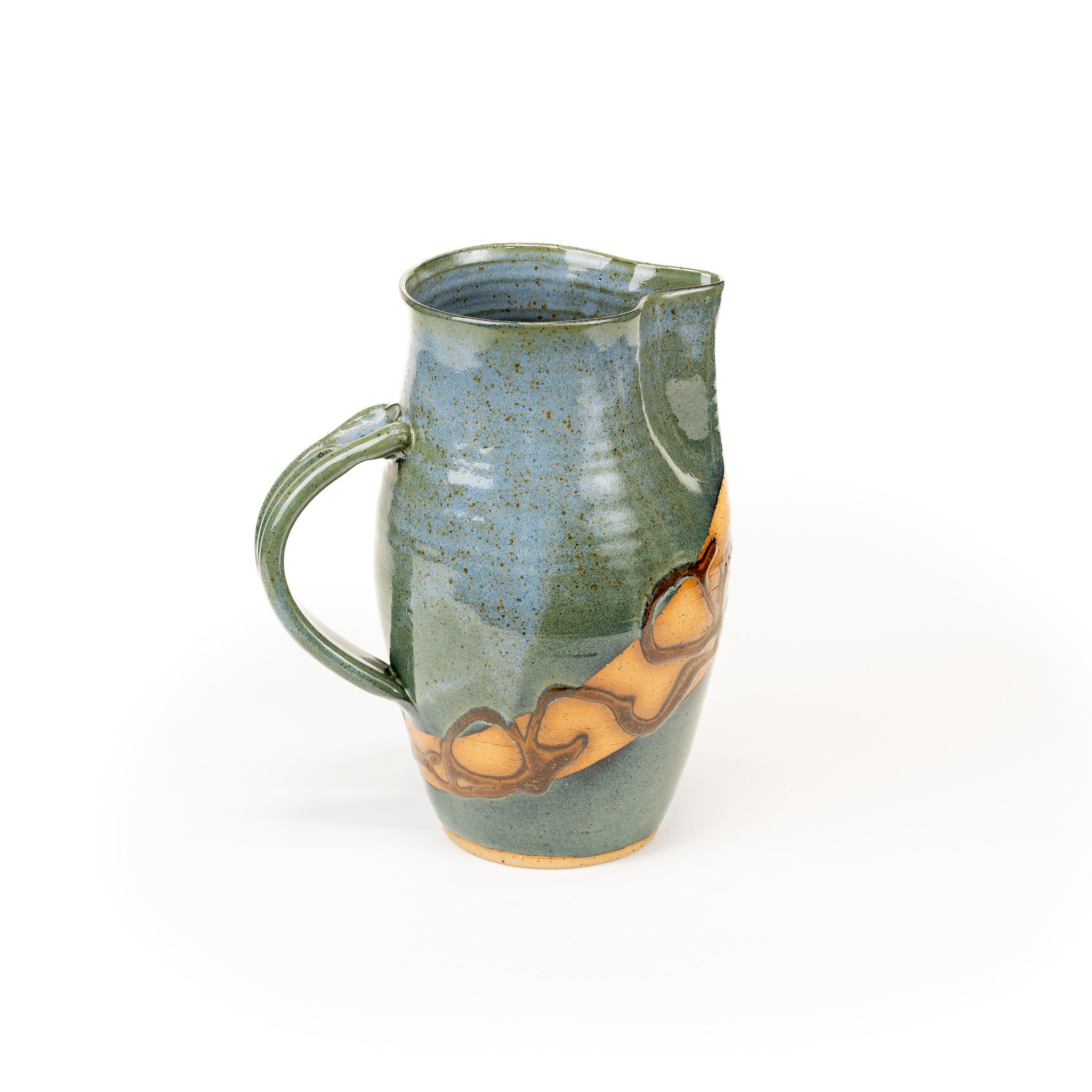 Finished in our Greybeard glaze, one of our four Signature Glazes. It contains tones of green, turquoise, blue, and grey, with an original design of copper and black textured glaze dancing over speckled stoneware.