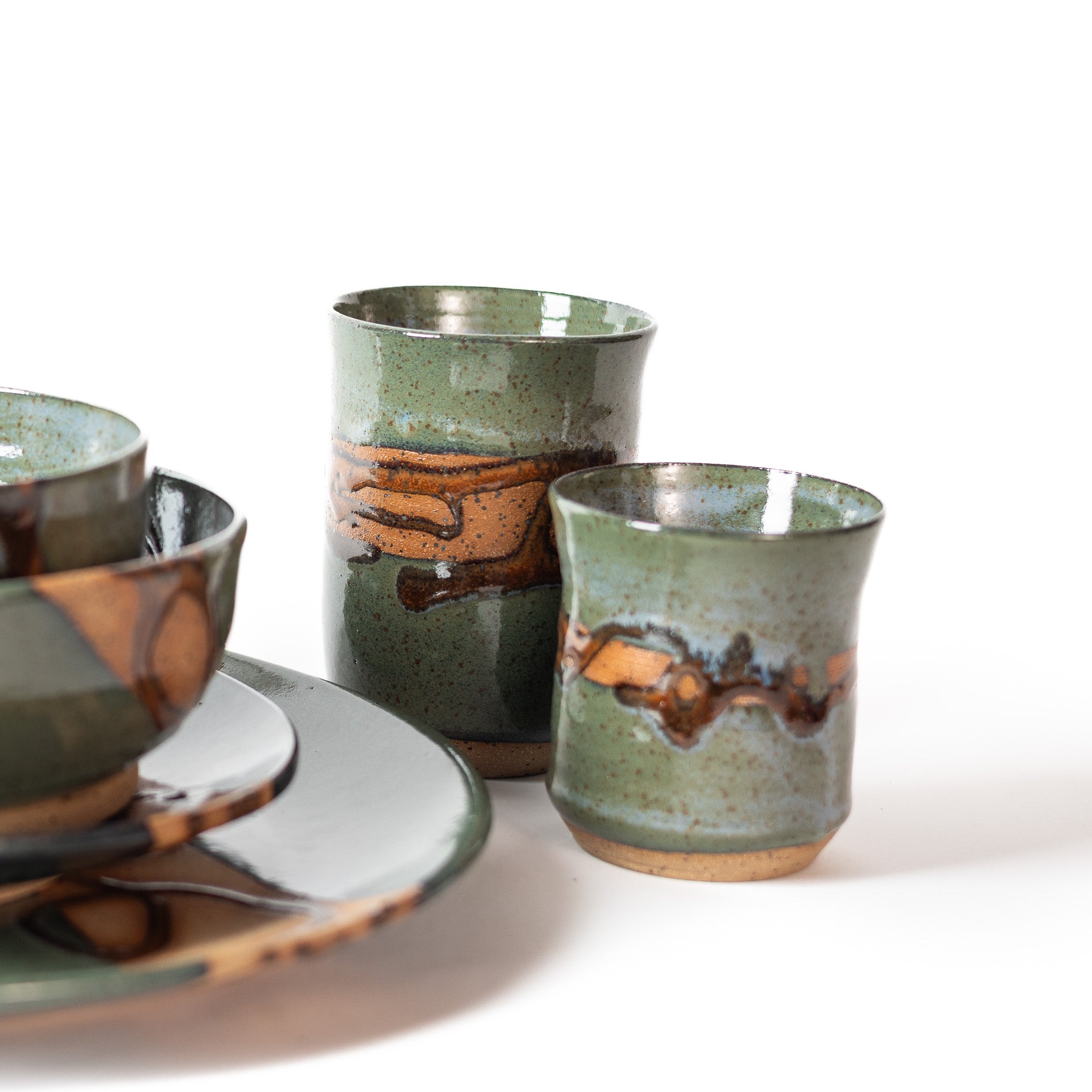 Greybeard is one of our four Signature Glazes. It contains tones of green, turquoise, blue, and grey, with an original design of copper and black textured glaze dancing over speckled stoneware.