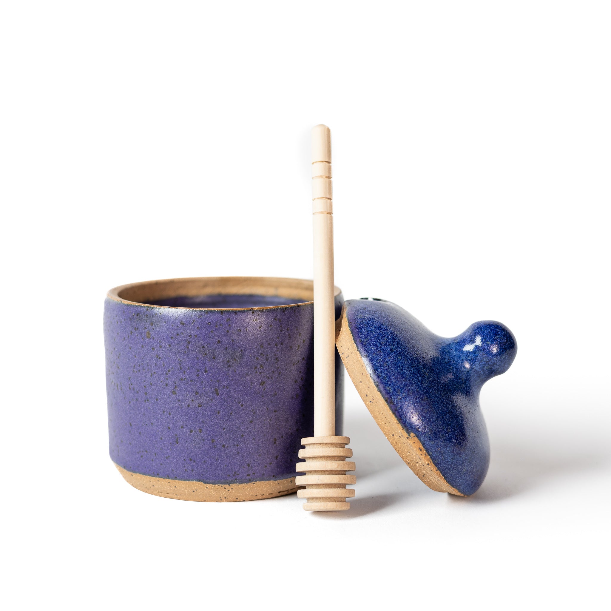 This handmade, Iris glazed wheel-thrown honey pot comes with a carved wooden honey stick, perfect for keeping honey close at hand by your tea or coffee station. Its elegant design combines practicality and charm, making it easy to serve honey while adding a cozy touch to your kitchen setup.