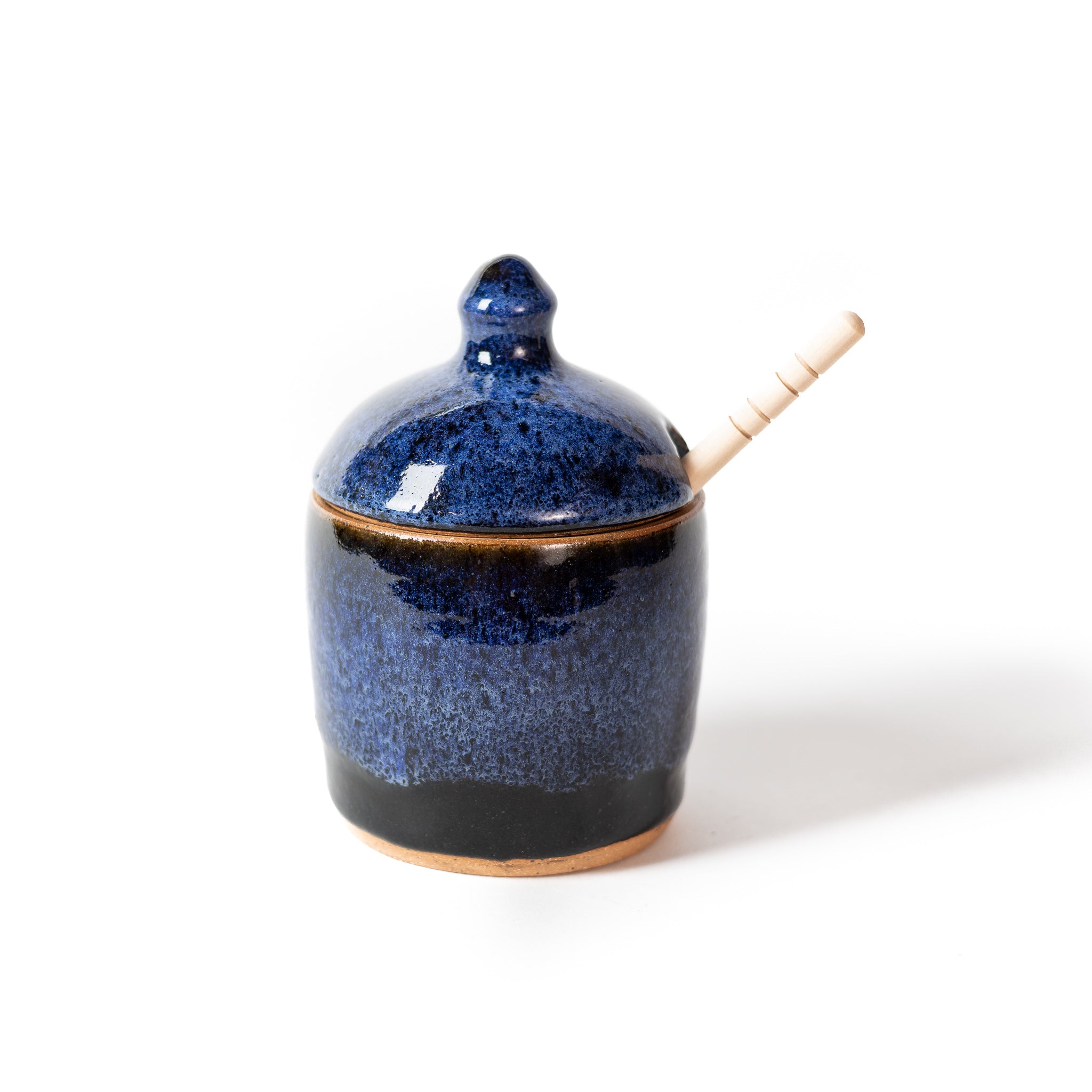 This handmade, Midnight glazed wheel-thrown honey pot comes with a carved wooden honey stick, perfect for keeping honey close at hand by your tea or coffee station. Its elegant design combines practicality and charm, making it easy to serve honey while adding a cozy touch to your kitchen setup.