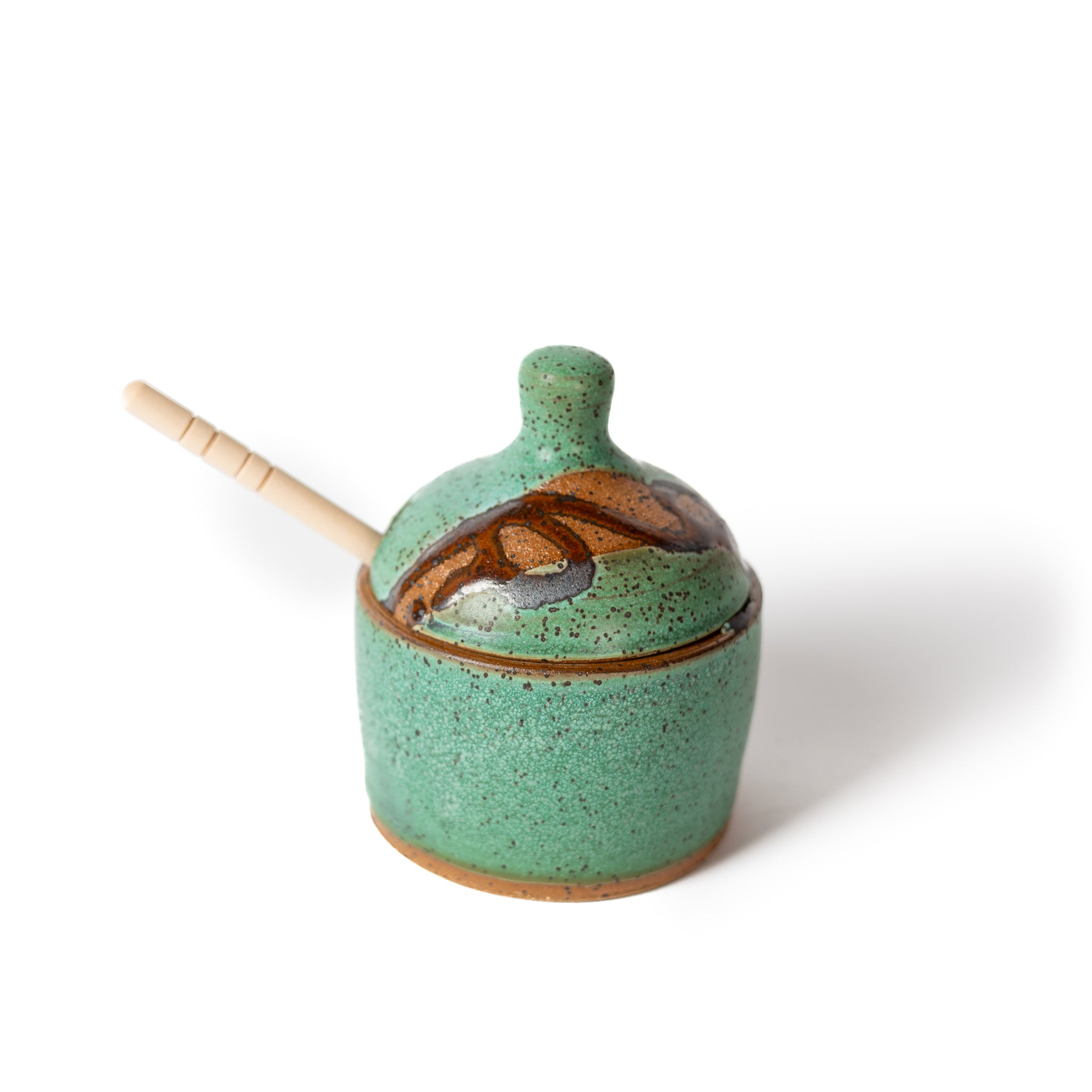 This handmade, Spruce Knob glazed wheel-thrown honey pot comes with a carved wooden honey stick, perfect for keeping honey close at hand by your tea or coffee station. Its elegant design combines practicality and charm, making it easy to serve honey while adding a cozy touch to your kitchen setup.