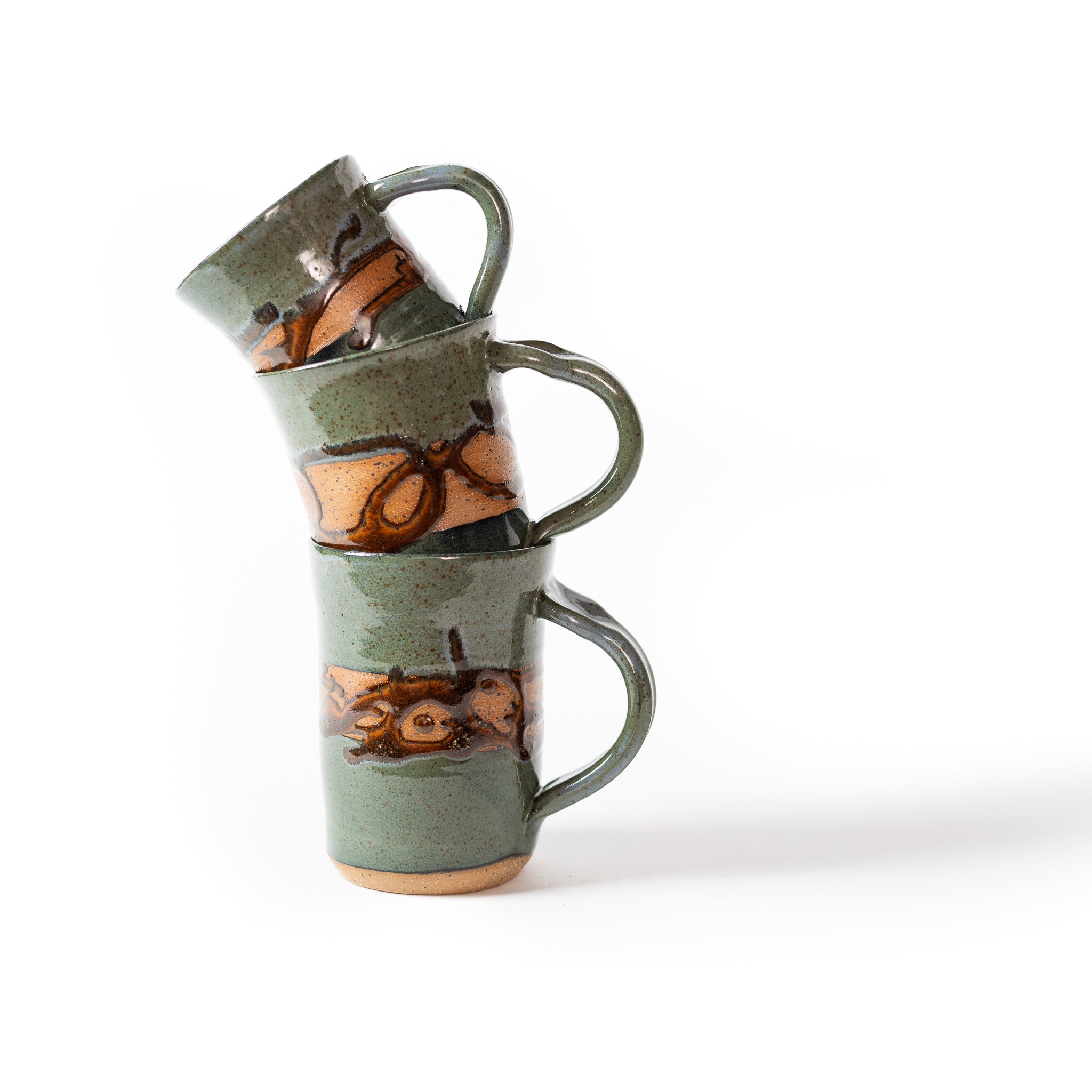 Greybeard is one of our four Signature Glazes. It contains tones of green, turquoise, blue, and grey, with an original design of copper and black textured glaze dancing over speckled stoneware.