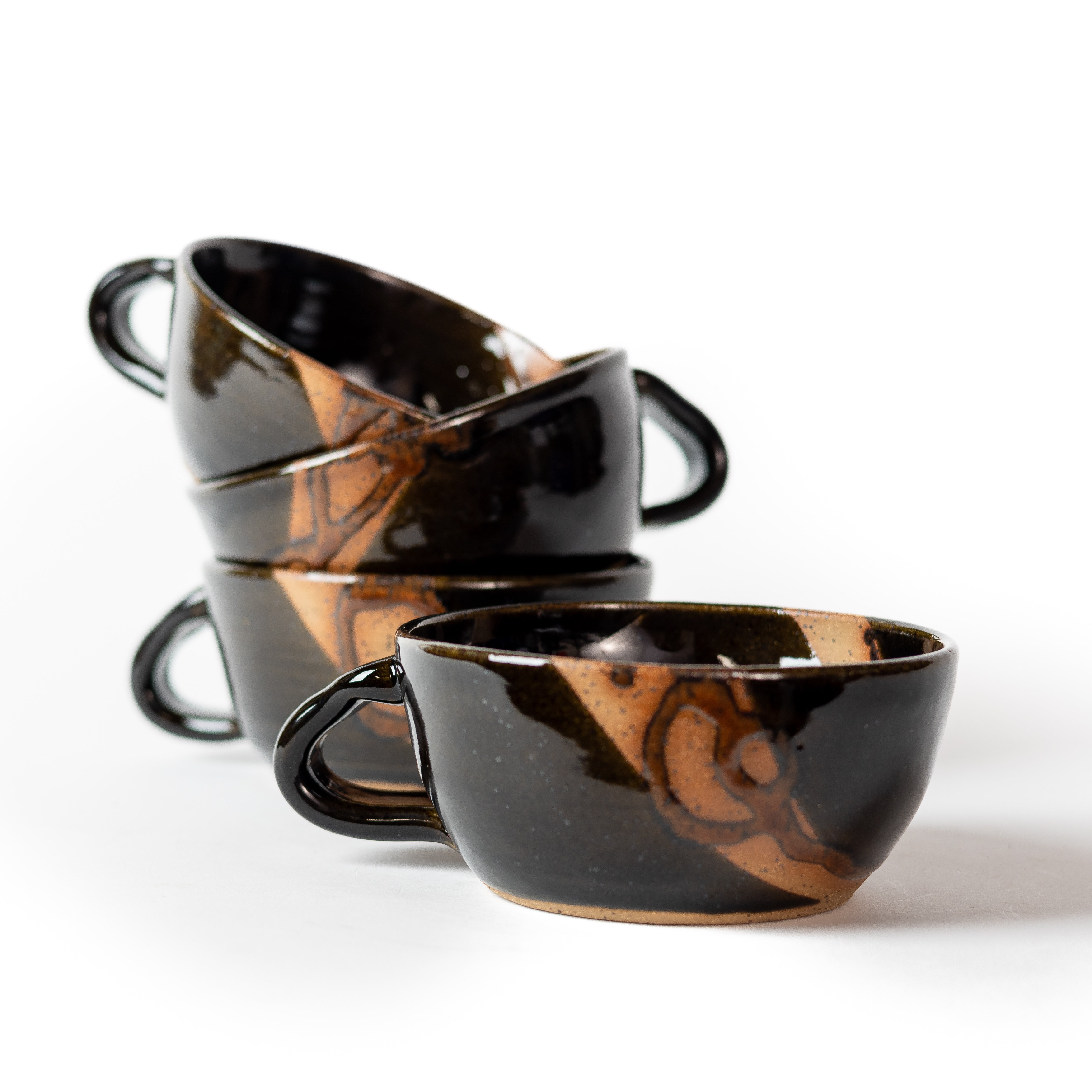 The Black Mountain glazed soup mug is a bowl with a handle! A mug for soup! The perfect vessel for oatmeal, hot chocolate with too much whipped cream, or a small salad. The Soup Mug is a wheel-thrown, heirloom-quality bowl with a convenient handle, designed perfectly for enjoying soup. Its classic design complements any dinnerware set but is equally lovely on its own. Microwave and dishwasher safe, it combines practicality with lasting style, making it a popular choice for everyday use.